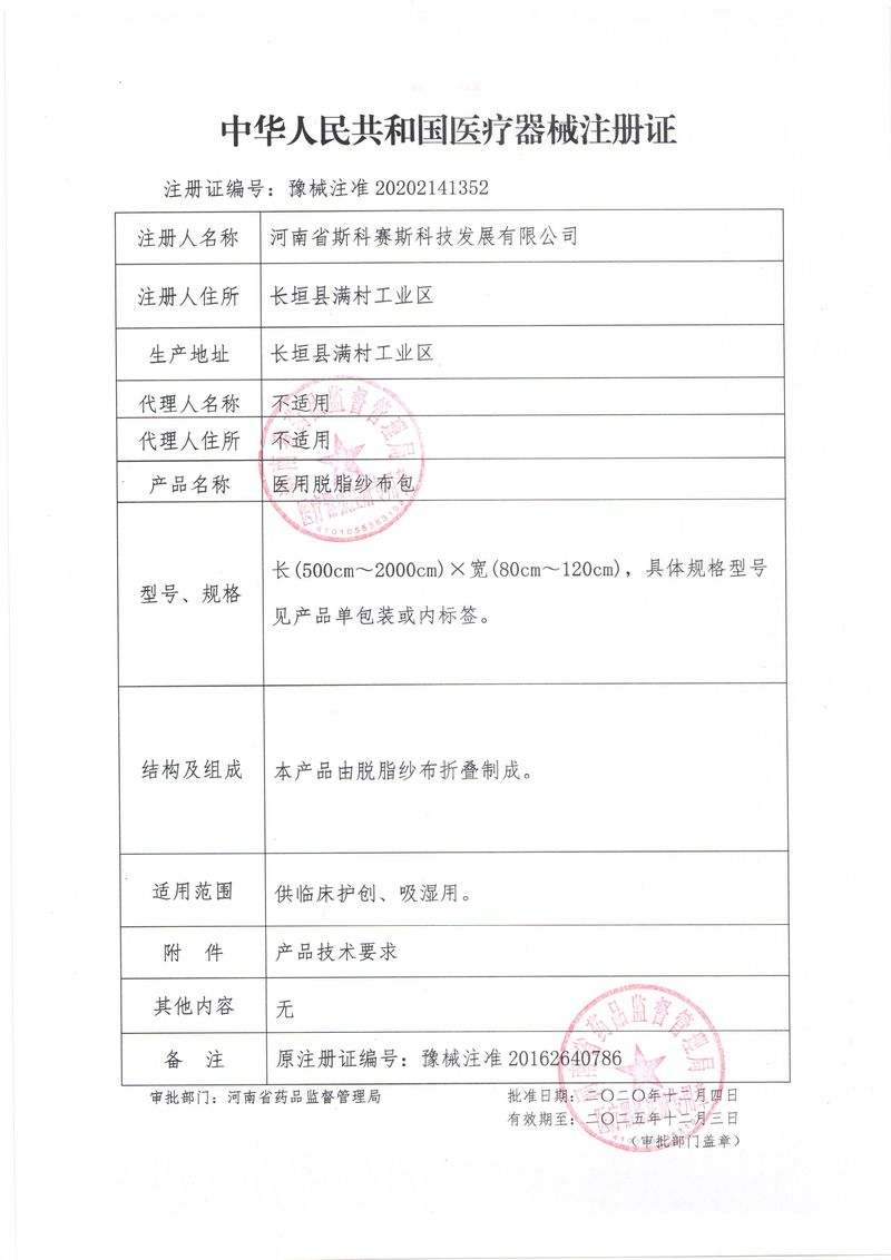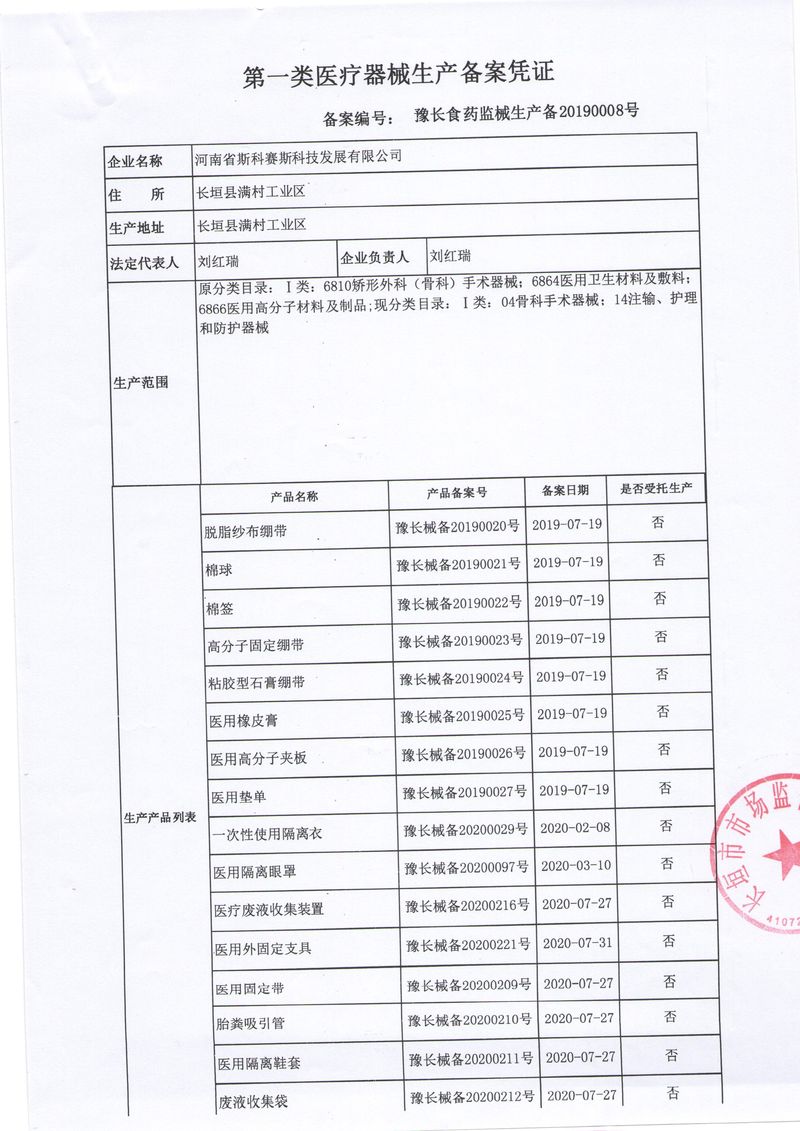 河南省斯科賽斯科技發(fā)展有限公司創(chuàng)建于 2011 年,位于“中國醫(yī)療耗材之都”- 河南省長垣縣,西臨 308 省道,南靠新菏鐵路,北依長濟(jì)高速,交通便捷,經(jīng)濟(jì)發(fā)達(dá),環(huán)境優(yōu)美。斯科賽斯積極進(jìn)入醫(yī)療健康和服務(wù)領(lǐng)域,秉承為用戶創(chuàng)造價(jià)值的理念,專注于醫(yī)用耗材解決方案的研發(fā)和運(yùn)營,并為用戶提供完善的產(chǎn)品解決方案;  斯科賽斯主要生產(chǎn)醫(yī)用麻醉系列、醫(yī)用高分子系列、醫(yī)用敷料包系列、醫(yī)用無紡布系列、醫(yī)用防護(hù)系列、醫(yī)用脫脂棉系列、生物材料制品類等七大類、100 多個(gè)品種、400 多個(gè)規(guī)格的產(chǎn)品。公司占地面積約 30000 平方米,建筑面積20000 平方米,擁有 10 萬級的凈化車間總面積 10000 平方米。擁有國際先進(jìn)水平的生產(chǎn)設(shè)備和檢測儀器,技術(shù)裝備精良,檢測手段完善,為醫(yī)療行業(yè)的不斷發(fā)展進(jìn)步提供保障。公司順利通過 ISO9001、ISO13485 質(zhì)量管理體系認(rèn)證?! ∷箍瀑愃箞?jiān)持研發(fā)高科技新產(chǎn)品,力爭在醫(yī)療器械關(guān)鍵領(lǐng)域取得技術(shù)和研發(fā)的重大突破;立足國內(nèi)和國際兩個(gè)市場,逐步實(shí)現(xiàn)管理理念、經(jīng)營機(jī)制、人力資源、技術(shù)、產(chǎn)品、市場等全方位對接,提高企業(yè)的核心競爭力;過去的歲月里,斯科賽斯砥礪前行,誠信務(wù)實(shí),銳意進(jìn)取,不斷創(chuàng)新,用自己的睿智和辛勞,以富有責(zé)任感的使命,在探索中追求,在追求中超越,致力于成為值得信賴的醫(yī)療用品生產(chǎn)企業(yè)!在未來的日子里,斯科賽斯將一如既往豪情滿懷,信心百倍,攜手并肩,執(zhí)著追求,向更高的的目標(biāo)前進(jìn),鑄造新的輝煌!